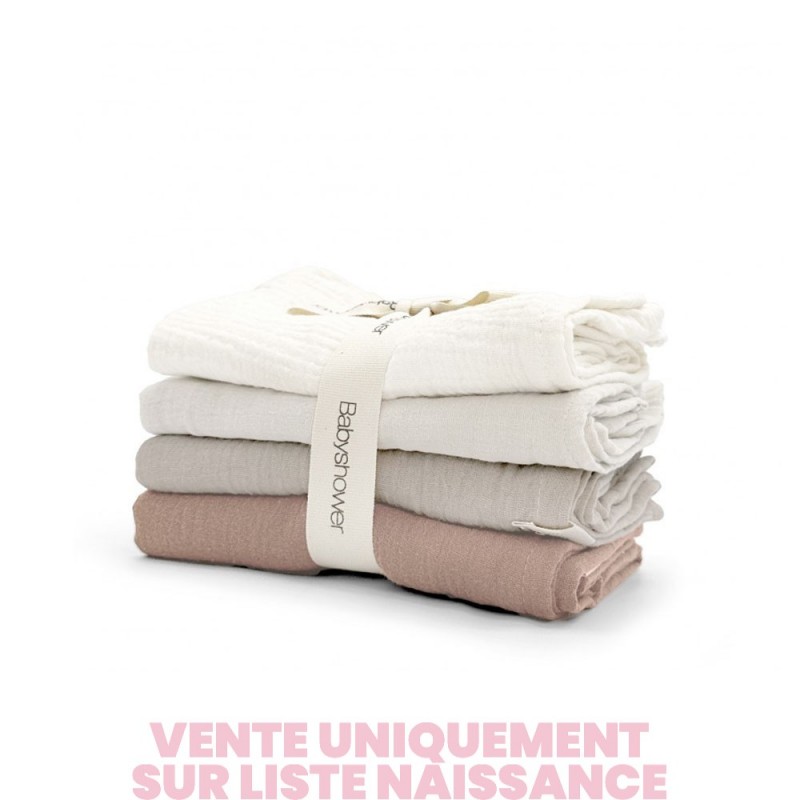 Ce lot comprend 4 langes de taille moyenne (70 x 70 cm), confectionnés en coton biologique 100 % et déclinés dans de jolis tons poudrés unis.