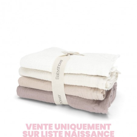 Ce lot comprend 4 langes de taille moyenne (70 x 70 cm), confectionnés en coton biologique 100 % et déclinés dans de jolis tons poudrés unis.