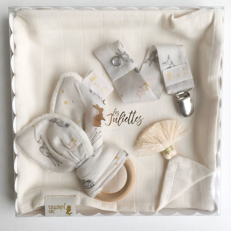 Composée au grès de l'inspiration de la créatrice, voici un adorable cadeau de naissance avec les petits essentiels préférés de nos clients.