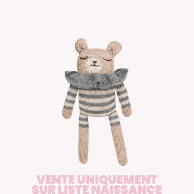 Avec sa combinaison rayée et son petit col, notre doudou ourson fera craquer les petits comme les grands ! Son extrême douceur et sa taille idéale pour les petites mains en font un joli cadeau de naissance.